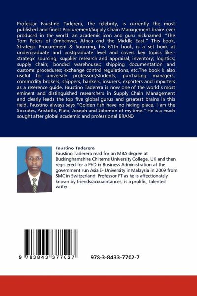 Professor Faustino Taderera, the celebrity, is currently the most published and finest Procurement/Supply Chain Management brains ever produced in the world, an academic icon and guru nicknamed, The Tom Peters of Zimbabwe, Africa and the Middle East. This book, Strategic Procurement & Sourcing, his 61th book, is a set book at undergraduate and postgraduate level and covers key topics like:- strategic sourcing, supplier research and appraisal; inventory; logistics; supply chain; bonded warehouses; shipping documentation and customs procedures; exchange control regulations, etc.The book is also useful to university professors/students, purchasing managers, commodity brokers, shippers, bankers, insurers, exporters and importers as a reference guide. Faustino Taderera is now one of the world's most eminent and distinguished researchers in Supply Chain Management and clearly leads the top five global gurus and greatest brains in this field. Faustino always says Golden fish have no hiding place. I am the Socrates, Aristotle, Plato, Joseph and Solomon of my time. He is a much sought after global academic and professional BRAND