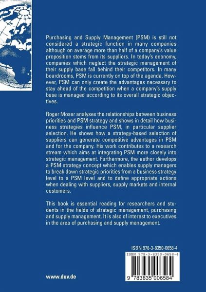 Roger Moser analyses the relationships between business priorities and PSM strategy and shows in detail how business strategies influence PSM, in particular supplier selection. He shows how a strategy-based selection of suppliers can generate competitive advantages in PSM and for the company. His work contributes to a research stream which aims at integrating PSM more closely into strategic management. Furthermore, the author develops a PSM strategy concept which enables supply managers to break down strategic priorities from a business strategy level to a PSM level and to define appropriate actions when dealing with suppliers, supply markets and internal customers.