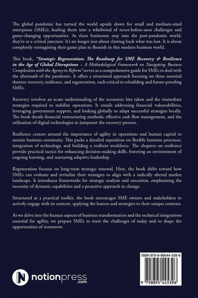 The global pandemic has turned the world upside down for small and medium-sized enterprises (SMEs), hurling them into a whirlwind of never-before-seen challenges and game-changing opportunities. As these businesses step into the post-pandemic world, they're at a critical juncture. It's no longer just about clawing back what was lost. It is about completely reimagining their game plan to flourish in this modern business world. This book, "Strategic Regeneration: The Roadmap for SME Recovery & Resilience in the Age of Global Disruptions; A Methodological Framework on Navigating Business Complexities with the Agency to Reform" serves as a comprehensive guide for SMEs to deal with the aftermath of the pandemic. It offers a structured approach focusing on three essential themes: recovery, resilience, and regeneration, each critical to rebuilding and future-proofing SMEs. Structured as a practical toolkit, the book encourages SME owners and stakeholders to actively engage with its content, applying the lessons and strategies to their unique contexts. As we delve into the human aspects of business transformation and the technical integrations essential for agility, we prepare SMEs to meet the challenges of today and to shape the opportunities of tomorrow.