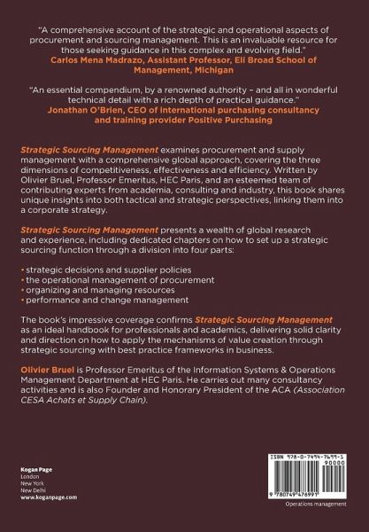 Strategic Sourcing Management examines procurement and supply management in detail, covering the three dimensions of competitiveness, effectiveness and efficiency. Written by Olivier Bruel, Professor Emeritus HEC Paris, and a team of contributing experts from academia, consulting and industry, the book is organised into four parts: strategic decisions; operational management of procurement and related supply chain; management of human resources and dedicated information systems; management of performance and change.