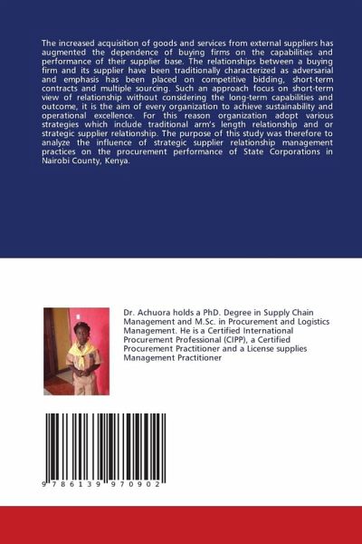 The increased acquisition of goods and services from external suppliers has augmented the dependence of buying firms on the capabilities and performance of their supplier base. The relationships between a buying firm and its supplier have been traditionally characterized as adversarial and emphasis has been placed on competitive bidding, short-term contracts and multiple sourcing. Such an approach focus on short-term view of relationship without considering the long-term capabilities and outcome, it is the aim of every organization to achieve sustainability and operational excellence. For this reason organization adopt various strategies which include traditional arm's length relationship and or strategic supplier relationship. The purpose of this study was therefore to analyze the influence of strategic supplier relationship management practices on the procurement performance of State Corporations in Nairobi County, Kenya.