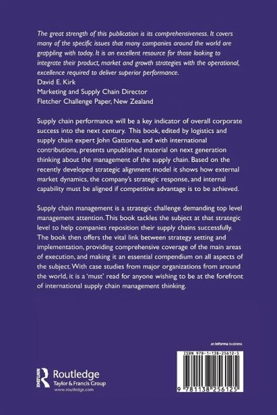 'Coverage of the supply chain lexicon is awesome. Everything you might want to know...examined in detail...Does it read well? Yes...Will it be well regarded by top management? Almost certainly.' Supply Management 'Comprehensive and lucid, genuinely strategic, leading edge. The great strength of this publication is its comprehensiveness in taking a strategic approach to the management of integrated value chains...an excellent resource for CEOs and other GMs who are looking to integrate their product market and growth strategies with the operational excellence required to deliver superior performance.' Amazon.com Customer review 'A comprehensive and authoritative book...a thorough exploration of the latest thinking...based on Andersen Consulting's strategic alignment model.' Business Books Direct Catalogue '...(the contributors) joint efforts deserve almost unreserved praise...John Gattorna has done a masterly job. The book is wide ranging and comprehensive. The contributions are scholarly but eminently readable.' Modern Management '...a series of highly useful and informative individual articles, which have been written to be read independently.' Future Filter 'A solid, well organized and written reference, this book does an excellent job of linking supply chain strategy with the nuts and bolts of implementation.' Warehousing Research & Education Directory - USA 'A worthwhile investment.' The Export Guide