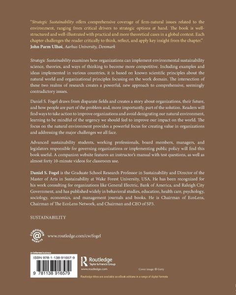 Strategic Sustainability examines how organizations can implement environmental sustainability science, theories, and ways of thinking to become more competitive. Including examples and ideas implemented in various countries, it is based on known scientific principles about the natural world and organizational principles focusing on the work domain. The intersection of these two realms of research creates a powerful and new approach to comprehensive, seemingly contradictory issues. Daniel S. Fogel draws from disparate fields and creates a story about organizations, their future and how people are part of the problem and, more importantly, part of the solution. Readers will find ways to take action to improve organizations and avoid denigrating our natural environment, learning to be mindful of the urgency we should feel to improve our impact on the world. The focus on the natural environment provides a powerful focus for creating value in organizations and addressing the major challenges we all face. Advanced sustainability students, working professionals and board members, managers and legislators responsible for governing organizations or implementing public policy will find this book useful. A companion website features an instructor's manual with test questions, as well as 38, 10-minute videos for classroom use.