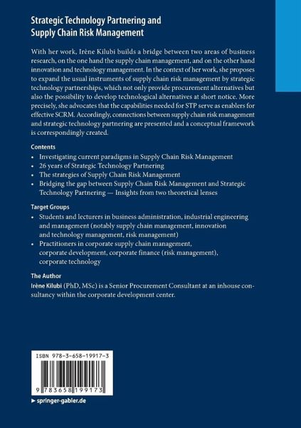 With her work, Irène Kilubi builds a bridge between two areas of business research, on the one hand the supply chain management, and on the other hand innovation and technology management. In the context of her work, she proposes to expand the usual instruments of supply chain risk management by strategic technology partnerships, which not only provide procurement alternatives but also the possibility to develop technological alternatives at short notice. More precisely, she advocates that the capabilities needed for STP serve as enablers for effective SCRM. Accordingly, connections between supply chain risk management and strategic technology partnering are presented and a conceptual framework is correspondingly created.