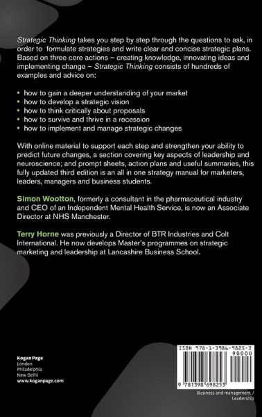 Strategic Thinking: A Step-by-Step Approach to Strategy and Leadership, now in its third edition, takes you step by step through sound strategic thinking by setting out the questions to ask. In the process of answering these questions and thinking through the important issues that they raise, you will learn how to formulate strategies and write clear and concise strategic plans. With new online material to support each step and help strengthen your ability to predict future changes, as well as a new section covering key aspects of leadership and neuroscience, this practical book will enable you to: gain a deeper understanding of your market; forecast where your organization is heading; think critically about proposals; write an effective strategic plan Also including prompt sheets, objectives, action plans and useful summaries, this fully updated third edition is a must-have for all practicing managers and business students. Online supporting resources for this book include downloadable templates including taking strategics decisions, creating strategic knowledge and assessing strategic ability.