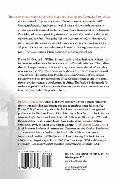" Increasingly marginalized since the end of the Cold War, the continent of Africa is struggling to identify both the root causes and possible solutions to the maladies that continue to plague it. The problems read like a laundry list of misrule in the aftermath of decolonization: rampant political corruption, internecine wars, widespread disease, underdevelopment, and economic collapse. In the early 1990s, a group of statesmen, academics, and civil leaders from all over Africa gathered to put together a comprehensive plan to make the continent become less dependent on the rest of the world and prepare it to compete in the new globalizing economy. Those who gathered to write what would come to be known as the Kampala Document envisioned an organization which would succeed where the Organization for African Unity (OAU) had failed. This new organization, the Conference on Security, Stability, Development and Cooperation in Africa (CSSDCA), will provide a forum for discussion of democratization, security issues, and sustainable development. This new book by noted scholars Francis Deng and I. William Zartman provides a ""mid-course"" appraisal of the progress of the CSSDCA, as well as charting its future in relation to other regional organizations. With a preface by President Olusegun Obasanjo, this book will undoubtedly become an important tool in understanding Africa's present and future. Francis Deng is a nonresident senior fellow in the Foreign Policy Studies program at the Brookings Institution. His books include Masses in Flight: The Global Crisis of Internal Displacement (Brookings, 1998, with Roberta Cohen), The Forsaken People: Case Studies of the Internally Displaced (Brookings, 1998, co-edited with Roberta Cohen). I. William Zartman is Jacob Blaustein Professor of International Organizations and Conflict Resolution and Director of African Studies at the Paul H. Nitze School of Advanced International Studies. "