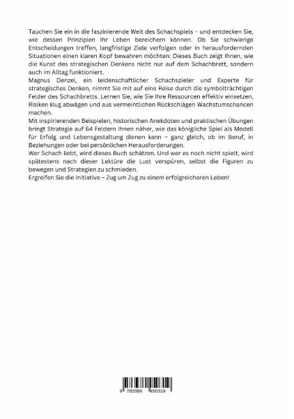 Tauchen Sie ein in die faszinierende Welt des Schachspiels - und entdecken Sie, wie dessen Prinzipien Ihr Leben bereichern können. Ob Sie schwierige Entscheidungen treffen, langfristige Ziele verfolgen oder in herausfordernden Situationen einen klaren Kopf bewahren möchten: Dieses Buch zeigt Ihnen, wie die Kunst des strategischen Denkens nicht nur auf dem Schachbrett, sondern auch im Alltag funktioniert.Magnus Denzel, ein leidenschaftlicher Schachspieler und Experte für strategisches Denken, nimmt Sie mit auf eine Reise durch die symbolträchtigen Felder des Schachbretts. Lernen Sie, wie Sie Ihre Ressourcen effektiv einsetzen, Risiken klug abwägen und aus vermeintlichen Rückschlägen Wachstumschancen machen.Mit inspirierenden Beispielen, historischen Anekdoten und praktischen Übungen bringt Strategie auf 64 Feldern Ihnen näher, wie das königliche Spiel als Modell für Erfolg und Lebensgestaltung dienen kann - ganz gleich, ob im Beruf, in Beziehungen oder bei persönlichen Herausforderungen.Wer Schach liebt, wird dieses Buch schätzen. Und wer es noch nicht spielt, wird spätestens nach dieser Lektüre die Lust verspüren, selbst die Figuren zu bewegen und Strategien zu schmieden.Ergreifen Sie die Initiative - Zug um Zug zu einem erfolgreicheren Leben!