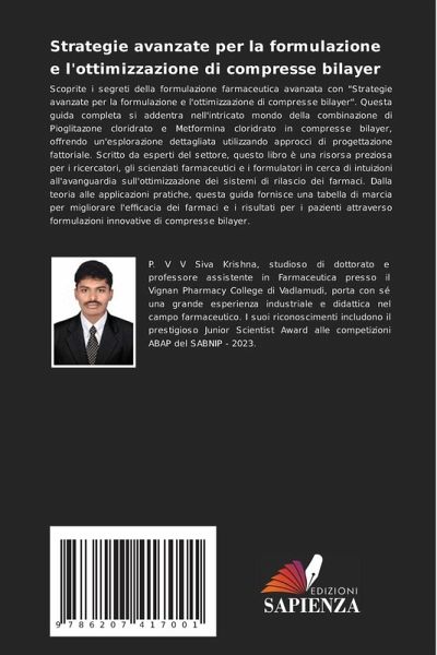 Scoprite i segreti della formulazione farmaceutica avanzata con "Strategie avanzate per la formulazione e l'ottimizzazione di compresse bilayer". Questa guida completa si addentra nell'intricato mondo della combinazione di Pioglitazone cloridrato e Metformina cloridrato in compresse bilayer, offrendo un'esplorazione dettagliata utilizzando approcci di progettazione fattoriale. Scritto da esperti del settore, questo libro è una risorsa preziosa per i ricercatori, gli scienziati farmaceutici e i formulatori in cerca di intuizioni all'avanguardia sull'ottimizzazione dei sistemi di rilascio dei farmaci. Dalla teoria alle applicazioni pratiche, questa guida fornisce una tabella di marcia per migliorare l'efficacia dei farmaci e i risultati per i pazienti attraverso formulazioni innovative di compresse bilayer.