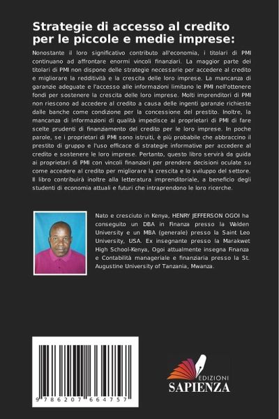 Nonostante il loro significativo contributo all'economia, i titolari di PMI continuano ad affrontare enormi vincoli finanziari. La maggior parte dei titolari di PMI non dispone delle strategie necessarie per accedere al credito e migliorare la redditività e la crescita delle loro imprese. La mancanza di garanzie adeguate e l'accesso alle informazioni limitano le PMI nell'ottenere fondi per sostenere la crescita delle loro imprese. Molti imprenditori di PMI non riescono ad accedere al credito a causa delle ingenti garanzie richieste dalle banche come condizione per la concessione del prestito. Inoltre, la mancanza di informazioni di qualità impedisce ai proprietari di PMI di fare scelte prudenti di finanziamento del credito per le loro imprese. In poche parole, se i proprietari di PMI sono istruiti, è più probabile che abbraccino il prestito di gruppo e l'uso efficace di strategie informative per accedere al credito e sostenere le loro imprese. Pertanto, questo libro servirà da guida ai proprietari di PMI con vincoli finanziari per prendere decisioni oculate su come accedere al credito per migliorare la crescita e lo sviluppo del settore. Il libro contribuirà inoltre alla letteratura imprenditoriale, a beneficio degli studenti di economia attuali e futuri che intraprendono le loro ricerche.
