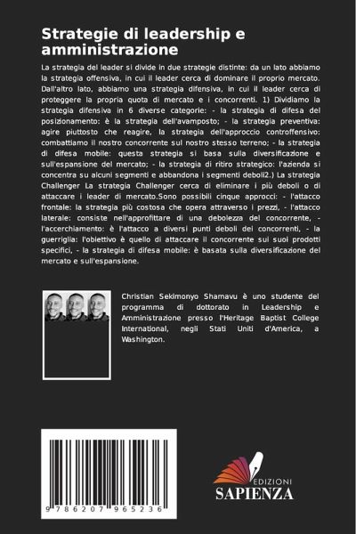 La strategia del leader si divide in due strategie distinte: da un lato abbiamo la strategia offensiva, in cui il leader cerca di dominare il proprio mercato. Dall'altro lato, abbiamo una strategia difensiva, in cui il leader cerca di proteggere la propria quota di mercato e i concorrenti. 1) Dividiamo la strategia difensiva in 6 diverse categorie: - la strategia di difesa del posizionamento: è la strategia dell'avamposto; - la strategia preventiva: agire piuttosto che reagire, la strategia dell'approccio controffensivo: combattiamo il nostro concorrente sul nostro stesso terreno; - la strategia di difesa mobile: questa strategia si basa sulla diversificazione e sull'espansione del mercato; - la strategia di ritiro strategico: l'azienda si concentra su alcuni segmenti e abbandona i segmenti deboli2.) La strategia Challenger La strategia Challenger cerca di eliminare i più deboli o di attaccare i leader di mercato.Sono possibili cinque approcci: - l'attacco frontale: la strategia più costosa che opera attraverso i prezzi, - l'attacco laterale: consiste nell'approfittare di una debolezza del concorrente, - l'accerchiamento: è l'attacco a diversi punti deboli dei concorrenti, - la guerriglia: l'obiettivo è quello di attaccare il concorrente sui suoi prodotti specifici, - la strategia di difesa mobile: è basata sulla diversificazione del mercato e sull'espansione.