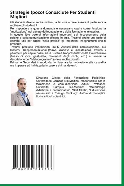 Gli studenti devono venire motivati a lezione o deve essere il professore a motivare gli studenti?Per rispondere a questa domanda è necessario capire come funziona la "motivazione" nel campo dell'educazione e della formazione innovativa.In questo libro troverai informazioni importanti sul funzionamento della psiche e sulla comunicazione efficace in aula. Troverai anche una serie di esercizi utili per capire "nella pratica" gli importanti insegnamenti che ti presento.Troverai preziose informazioni sui 5 Assunti della comunicazione, sui Sistemi Rappresentazionali (Visivo, Auditivo e Cinestesico), troverai i parametri per capire quale sia il Sistema Rappresentazionale Preferenziale (flusso di voce, gestualità, movimenti degli occhi, etc.) e troverai la descrizione dei "Metaprogrammi" (o leve motivazionali)Primari e Secondari in modo da non lasciare la motivazione alla casualità ma imparare ad indirizzarla in base a chi hai davanti.