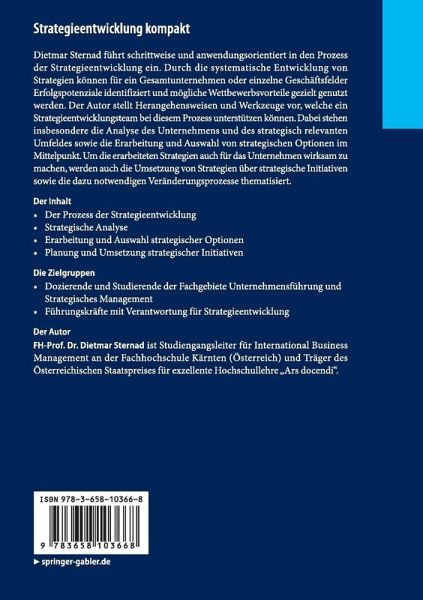 Dietmar Sternad führt schrittweise und anwendungsorientiert in den Prozess der Strategieentwicklung ein. Durch die systematische Entwicklung von Strategien können für ein Gesamtunternehmen oder einzelne Geschäftsfelder Erfolgspotenziale identifiziert und mögliche Wettbewerbsvorteile gezielt genutzt werden. Der Autor stellt Herangehensweisen und Werkzeuge vor, welche ein Strategieentwicklungsteam bei diesem Prozess unterstützen können. Dabei stehen insbesondere die Analyse des Unternehmens und des strategisch relevanten Umfeldes sowie die Erarbeitung und Auswahl von strategischen Optionen im Mittelpunkt. Um die erarbeiteten Strategien auch für das Unternehmen wirksam zu machen, werden auch die Umsetzung von Strategien über strategische Initiativen sowie die dazu notwendigen Veränderungsprozesse thematisiert.