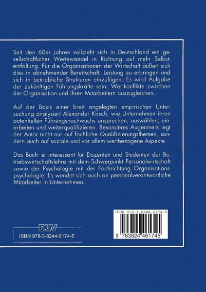 Auf der Basis einer breit angelegten empirischen Untersuchung analysiert Alexander Kirsch, wie Unternehmen ihren potentiellen Führungsnachwuchs ansprechen, auswählen, einarbeiten und weiter-qualifizieren.