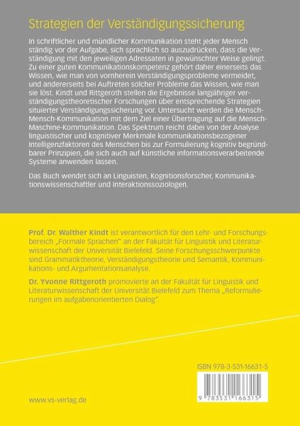 In schriftlicher und mündlicher Kommunikation steht jeder Mensch ständig vor der Aufgabe, sich sprachlich so auszudrücken, dass die Verständigung mit den jeweiligen Adressaten in gewünschter Weise gelingt. Zu einer guten Kommunikationskompetenz gehört daher einerseits das Wissen, wie man von vornherein Verständigungsprobleme vermeidet, und andererseits bei Auftreten solcher Probleme das Wissen, wie man sie löst. Kindt und Rittgeroth stellen die Ergebnisse langjähriger verständigungstheoretischer Forschungen über entsprechende Strategien situierter Verständigungssicherung vor. Untersucht werden die Mensch-Mensch-Kommunikation mit dem Ziel einer Übertragung auf die Mensch-Maschine-Kommunikation. Das Spektrum reicht dabei von der Analyse linguistischer und kognitiver Merkmale kommunikationsbezogener Intelligenzfaktoren des Menschen bis zur Formulierung kognitiv begründbarer Prinzipien, die sich auch auf künstliche informationsverarbeitende Systeme anwenden lassen.