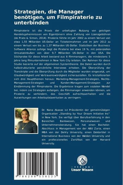 Filmpiraterie ist die Praxis der unbefugten Nutzung von geistigen Handelsgeheimnissen von Eigentümern ohne Zahlung von Lizenzgebühren (de Prato & Simon, 2014). Piraterie führte im Jahr 2002 zu einem Verlust von etwa 1,55 Milliarden US-Dollar an Ticketeinnahmen und im Jahr 2012 zu einem Verlust von bis zu 1,37 Milliarden US-Dollar. Statistiken der Business Software Alliance zufolge liegt die Piraterie bei etwa 19 %, mit potenziellen Umsatzeinbußen von über 9,7 Milliarden US-Dollar in den USA. Die Stichprobe für diese Arbeit bestand aus 6 Filmmanagern, die mindestens 5 Jahre lang Filmunternehmen in New York City leiteten. Der Rahmen für diese Studie basierte auf der allgemeinen Systemtheorie. Die Daten wurden durch halbstrukturierte persönliche Interviews erhoben. Die Überprüfung der Transkripte und die Überprüfung durch die Mitglieder wurden eingesetzt, um Glaubwürdigkeit und Vertrauenswürdigkeit sicherzustellen. Es kristallisierten sich drei Hauptthemen heraus: Marketing-Management-Strategien, Rechts-Management-Strategien und Kunden-Management-Strategien zur Eindämmung der Filmpiraterie. Die Ergebnisse tragen zum sozialen Wandel bei, indem sie Strategien aufzeigen, die Filmmanager anwenden können, um Piraterie zu verhindern, das Geschäft aufrechtzuerhalten und die Auswirkungen von Arbeitsplatzverlusten zu verringern.