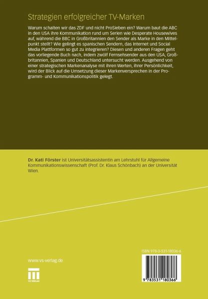 Warum schalten wir das ZDF und nicht ProSieben ein? Warum baut die ABC in den USA ihre Kommunikation rund um Serien wie Desperate Housewives auf, während die BBC in Großbritannien den Sender als Marke in den Mittelpunkt stellt? Wie gelingt es spanischen Sendern, das Internet und Social Media Plattformen so gut zu integrieren? Diesen und anderen Fragen geht das vorliegende Buch nach, indem zwölf Fernsehsender aus den USA, Großbritannien, Spanien und Deutschland untersucht werden. Ausgehend von einer strategischen Markenanalyse mit ihren Werten, ihrer Persönlichkeit, wird der Blick auf die Umsetzung dieser Markenversprechen in der Programm- und Kommunikationspolitik gelegt.
