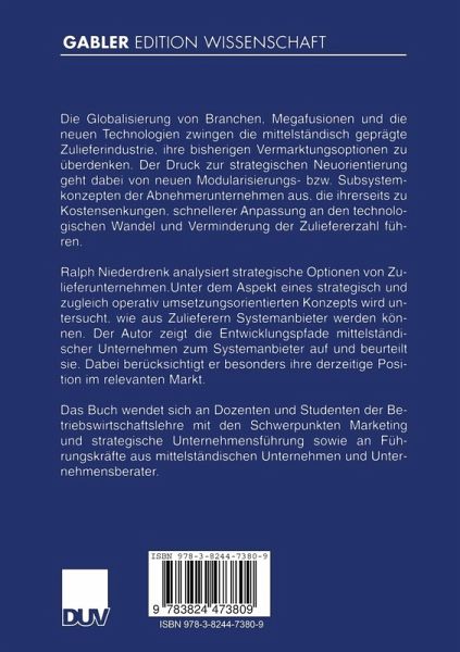 Ralph Niederdrenk analysiert strategische Optionen von Zulieferunternehmen.Unter dem Aspekt eines strategisch und zugleich operativ umsetzungsorientierten Konzepts wird untersucht, wie aus Zulieferern Systemanbieter werden können. Der Autor zeigt die Entwicklungspfade mittelständischer Unternehmen zum Systemanbieter auf und beurteilt sie. Dabei berücksichtigt er besonders ihre derzeitige Position im relevanten Markt.