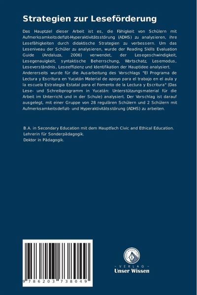 Das Hauptziel dieser Arbeit ist es, die Fähigkeit von Schülern mit Aufmerksamkeitsdefizit-Hyperaktivitätsstörung (ADHS) zu analysieren, ihre Lesefähigkeiten durch didaktische Strategien zu verbessern. Um das Leseniveau der Schüler zu analysieren, wurde der Reading Skills Evaluation Guide (Andaluza, 2006) verwendet, der Lesegeschwindigkeit, Lesegenauigkeit, syntaktische Beherrschung, Wortschatz, Lesemodus, Leseverständnis, Leseeffizienz und Identifikation der Hauptidee analysiert.Andererseits wurde für die Ausarbeitung des Vorschlags "El Programa de Lectura y Escritura en Yucatán Material de apoyo para el trabajo en el aula y la escuela Estrategia Estatal para el Fomento de la Lectura y Escritura" (Das Lese- und Schreibprogramm in Yucatán: Unterstützungsmaterial für die Arbeit im Unterricht und in der Schule) analysiert. Der Vorschlag ist darauf ausgelegt, mit einer Gruppe von 28 regulären Schülern und 2 Schülern mit Aufmerksamkeitsdefizit- und Hyperaktivitätsstörung (ADHS) zu arbeiten.