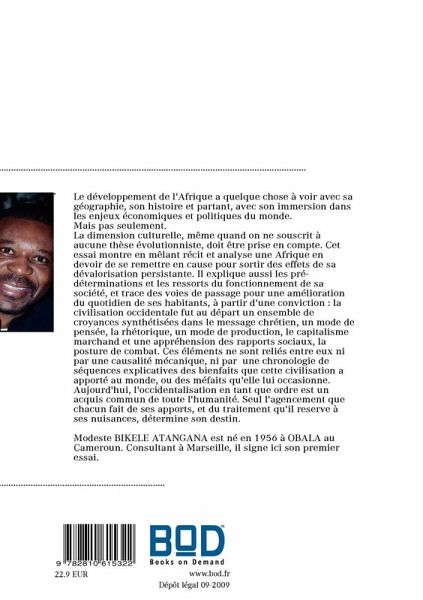 Le développement de l'Afrique a quelque chose à voir avec sa géographie, son histoire et partant, avec son immersion dans les enjeux économiques et politiques du monde.Mais pas seulement. La dimension culturelle, même quand on ne souscrit à aucune thèse évolutionniste, doit être prise en compte. Cet essai nous montre en mêlant récit et analyse, une Afrique en devoir de se remettre en cause pour sortir des effets de sa dévalorisation permanente. Il explique les pré-déterminations et les ressorts du fonctionnement de sa société, trace des voies vers des solutions concrètes à partir d'une conviction : en ce début de 21ième siècle, "l'occidentalisation" est un acquis commun à toute l'humanité. Seul l'agencement que chacun fait de ces apports et du traitement de ses nuisances détermine son destin