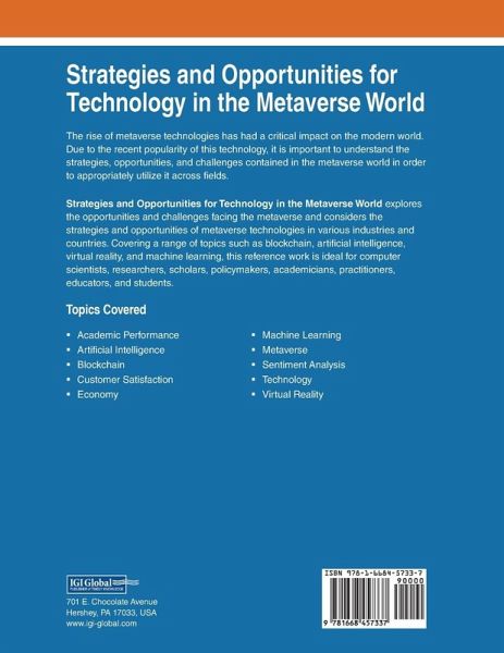 The rise of metaverse technologies has had a critical impact on the modern world. Due to the recent popularity of this technology, it is important to understand the strategies, opportunities, and challenges contained in the metaverse world in order to appropriately utilize it across fields. Strategies and Opportunities for Technology in the Metaverse World explores the opportunities and challenges facing the metaverse and considers the strategies and opportunities of metaverse technologies in various industries and countries. Covering a range of topics such as blockchain, artificial intelligence, virtual reality, and machine learning, this reference work is ideal for computer scientists, researchers, scholars, policymakers, academicians, practitioners, educators, and students.