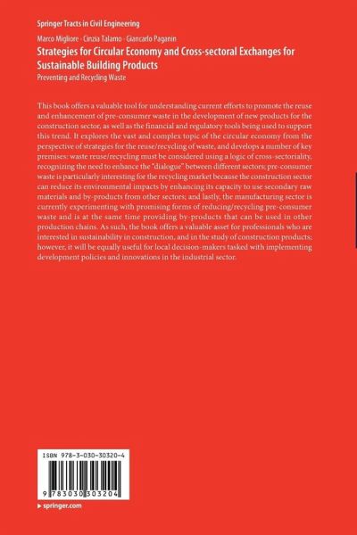 This book offers a valuable tool for understanding current efforts to promote the reuse and enhancement of pre-consumer waste in the development of new products for the construction sector, as well as the financial and regulatory tools being used to support this trend. It explores the vast and complex topic of the circular economy from the perspective of strategies for the reuse/recycling of waste, and develops a number of key premises: waste reuse/recycling must be considered using a logic of cross-sectoriality, recognizing the need to enhance the "dialogue" between different sectors; pre-consumer waste is particularly interesting for the recycling market because the construction sector can reduce its environmental impacts by enhancing its capacity to use secondary raw materials and by-products from other sectors; and lastly, the manufacturing sector is currently experimenting with promising forms of reducing/recycling pre-consumer waste and is at the same time providing by-products that can be used in other production chains. As such, the book offers a valuable asset for professionals who are interested in sustainability in construction, and in the study of construction products; however, it will be equally useful for local decision-makers tasked with implementing development policies and innovations in the industrial sector.