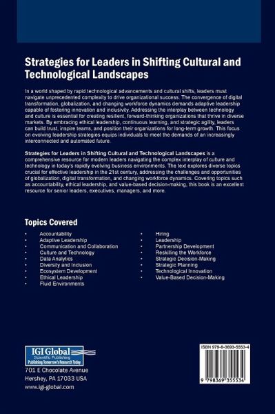 In a world shaped by rapid technological advancements and cultural shifts, leaders must navigate unprecedented complexity to drive organizational success. The convergence of digital transformation, globalization, and changing workforce dynamics demands adaptive leadership capable of fostering innovation and inclusivity. Addressing the interplay between technology and culture is essential for creating resilient, forward-thinking organizations that thrive in diverse markets. By embracing ethical leadership, continuous learning, and strategic agility, leaders can build trust, inspire teams, and position their organizations for long-term growth. This focus on evolving leadership strategies equips individuals to meet the demands of an increasingly interconnected and automated future. Strategies for Leaders in Shifting Cultural and Technological Landscapes is a comprehensive resource for modern leaders navigating the complex interplay of culture and technology in today's rapidly evolving business environments. The text explores diverse topics crucial for effective leadership in the 21st century, addressing the challenges and opportunities of globalization, digital transformation, and changing workforce dynamics. Covering topics such as accountability, ethical leadership, and value-based decision-making, this book is an excellent resource for senior leaders, executives, managers, and more.