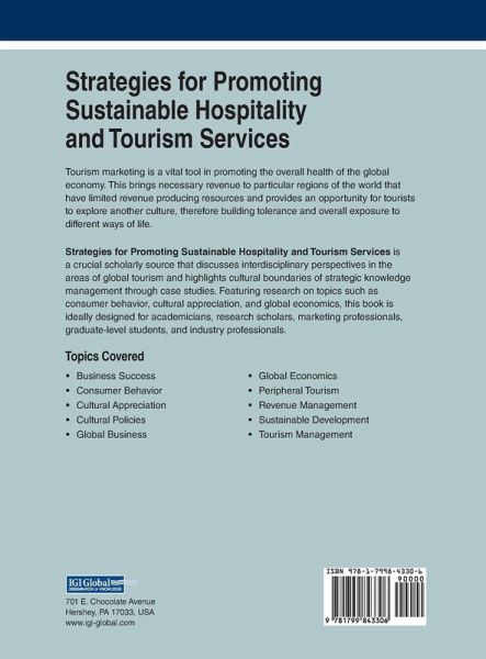 Tourism marketing is a vital tool in promoting the overall health of the global economy. This brings necessary revenue to particular regions of the world that have limited revenue producing resources and provides an opportunity for tourists to explore another culture, therefore building tolerance and overall exposure to different ways of life. Strategies for Promoting Sustainable Hospitality and Tourism Services is a crucial scholarly source that discusses interdisciplinary perspectives in the areas of global tourism and highlights cultural boundaries of strategic knowledge management through case studies. Featuring research on topics such as consumer behavior, cultural appreciation, and global economics, this book is ideally designed for academicians, research scholars, marketing professionals, graduate-level students, and industry professionals.