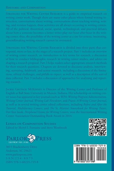 LENSES ON COMPOSITION STUDIES Series Editors: Sheryl I. Fontaine and Steve Westbrook. STRATEGIES FOR WRITING CENTER RESEARCH is a guide to empirical research on writing center work. Though there are many other places where formal writing instruction, conversations about writing, conversations about teaching writing, writing, and revision happen, these activities are all always occurring in writing centers. All of the political, theoretical, social, spatial, technological, and practical debates about how a someone becomes a better writer play out hour after hour in the writing center; thus, the possibility of the writing center as a site for serious, interesting, groundbreaking writing research cannot be overstated. STRATEGIES FOR WRITING CENTER RESEARCH is divided into three parts that correspond, more or less, to the stages of a research project. Part 1 includes an overview of writing center research, an introduction to key terms for research, a discussion of how to conduct bibliographic research in writing center studies, and advice on shaping a research proposal. Part 2 helps readers select appropriate research methods for their research questions. Chapters are devoted to discourse analysis, interviewing, surveying, fieldwork, and action research, including a discussion of the limitations, ethical challenges, and pitfalls to expect, as well as a description of the sort of data collected. Part 3 includes a discussion of approaches for analyzing and reporting research. JACKIE GRUTSCH MCKINNEY is Director of the Writing Center and Professor of English at Ball State University in Muncie, Indiana. Her scholarship on writing center issues has appeared in key journals such as WPA: Writing Program Administration, Writing Center Journal, Writing Lab Newsletter, and Praxis: A Writing Center Journal, as well as in several writing center edited collections, including Before and After the Tutorial, Multiliteracy Centers, and The St. Martin's Sourcebook for Writing Tutors. Her first book, Peripheral Visions for Writing Centers, won the International Writing Center Association Outstanding Book Award in 2014.