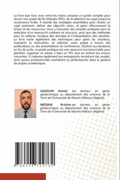 Le livre que vous avez entre les mains propose un guide complet pour réussir son projet de fin d'études (PFE), de la sélection du sujet jusqu'à la soutenance finale. Il aborde des stratégies essentielles pour choisir un sujet pertinent, définir des objectifs clairs, et gérer efficacement le temps et les ressources. Vous y trouverez des conseils pratiques pour la rédaction d'un manuscrit cohérent et structuré, ainsi que des méthodes pour la collecte, l'analyse des données et l'interprétation des résultats. Le livre traite également des techniques pour gérer les imprévus, maintenir la motivation, et valoriser votre projet à travers des publications ou des présentations en conférences. Destiné aux étudiants en fin de cycle, ce guide pratique est une ressource incontournable pour planifier, organiser et mener à bien un PFE tout en évitant les erreurs courantes. Il s'adresse également aux enseignants encadrant des projets, ainsi qu'aux professionnels souhaitant se perfectionner dans la gestion de projets académiques.