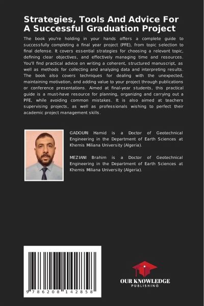 The book you're holding in your hands offers a complete guide to successfully completing a final year project (PFE), from topic selection to final defense. It covers essential strategies for choosing a relevant topic, defining clear objectives, and effectively managing time and resources. You'll find practical advice on writing a coherent, structured manuscript, as well as methods for collecting and analyzing data and interpreting results. The book also covers techniques for dealing with the unexpected, maintaining motivation, and adding value to your project through publications or conference presentations. Aimed at final-year students, this practical guide is a must-have resource for planning, organizing and carrying out a PFE, while avoiding common mistakes. It is also aimed at teachers supervising projects, as well as professionals wishing to perfect their academic project management skills.