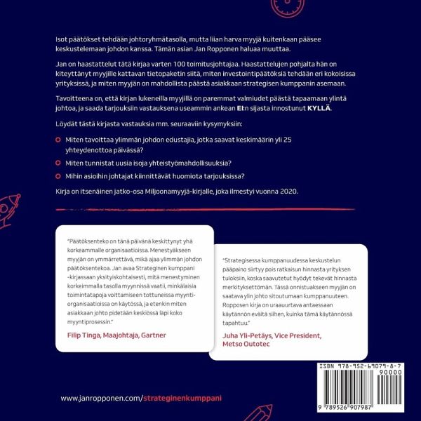 Isot päätökset tehdään johtoryhmätasolla, mutta liian harva myyjä kuitenkaan pääsee keskustelemaan johdon kanssa. Tämän asian Jan Ropponen haluaa muuttaa. Jan on haastattelut tätä kirjaa varten 100 toimitusjohtajaa. Haastattelujen pohjalta hän on kiteyttänyt myyjille kattavan tietopaketin siitä, miten investointipäätöksiä tehdään eri kokoisissa yrityksissä, ja miten myyjän on mahdollista päästä asiakkaan strategisen kumppanin asemaan. Tavoitteena on, että kirjan lukeneilla myyjillä on paremmat valmiudet päästä tapaamaan ylintä johtoa, ja saada tarjouksiin vastauksena useammin ankean EI:n sijasta innostunut KYLLÄ. Löydät tästä kirjasta vastauksia mm. seuraaviin kysymyksiin: Miten tavoittaa ylimmän johdon edustajia, jotka saavat keskimäärin yli 25 yhteydenottoa päivässä? Miten tunnistat uusia isoja yhteistyömahdollisuuksia? Mihin asioihin johtajat kiinnittävät huomiota tarjouksissa? Kirja on itsenäinen jatko-osa Miljoonamyyjä-kirjalle, joka ilmestyi vuonna 2020. "Päätöksenteko on tänä päivänä keskittynyt yhä korkeammalle organisaatioissa. Menestyäkseen myyjän on ymmärrettävä, mikä ajaa ylimmän johdon päätöksentekoa. Jan avaa Strateginen kumppani -kirjassaan yksityiskohtaisesti, mitä menestyminen korkeimmalla tasolla myynnissä vaatii, minkälaisia toimintatapoja voittamiseen tottuneissa myyntiorganisaatioissa on käytössä, ja etenkin miten asiakkaan johto pidetään keskiössä läpi koko myyntiprosessin." -Filip Tinga, Maajohtaja, Gartner "Strategisessa kumppanuudessa keskustelun pääpaino siirtyy pois ratkaisun hinnasta yrityksen tuloksiin, koska saavutetut hyödyt tekevät hinnasta merkityksettömän. Tässä onnistuakseen myyjän on saatava ylin johto sitoutumaan kumppanuuteen. Ropposen kirja on uraauurtava antaessaan käytännön eväitä siihen, kuinka tämä käytännössä tapahtuu." -Juha Yli-Petäys, Vice President, Metso Outotec