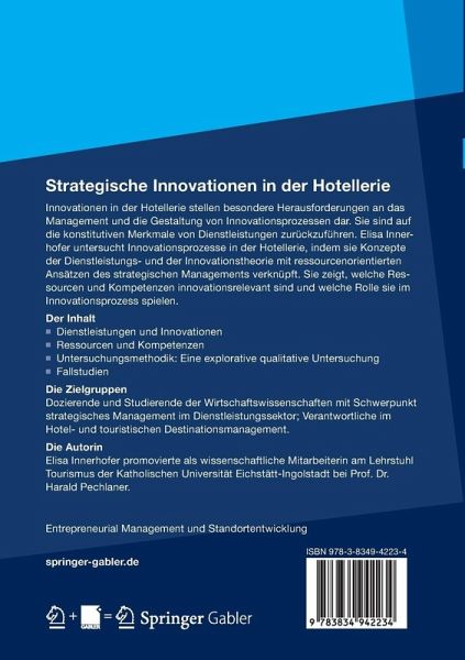 Innovationen in der Hotellerie stellen besondere Herausforderungen an das Management und die Gestaltung von Innovationsprozessen dar. Sie sind auf die konstitutiven Merkmale von Dienstleistungen zurückzuführen. Elisa Innerhofer untersucht Innovationsprozesse in der Hotellerie, indem sie Konzepte der Dienstleistungs- und der Innovationstheorie mit ressourcenorientierten Ansätzen des Strategischen Managements verknüpft. Sie zeigt, welche Ressourcen und Kompetenzen innovationsrelevant sind und welche Rolle sie im Innovationsprozess spielen.