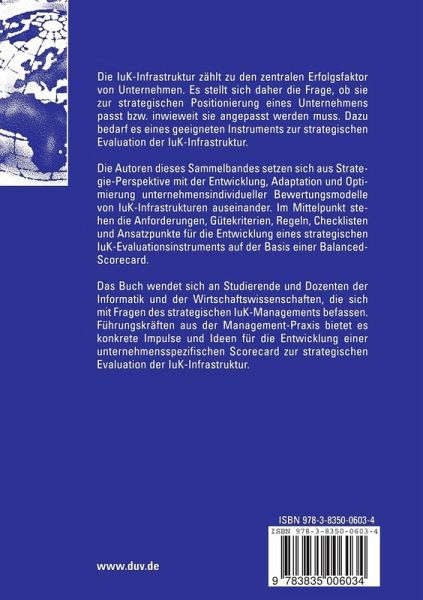 Die Autoren dieses Sammelbandes setzen sich aus Strategie-Perspektive mit der Entwicklung, Adaptation und Optimierung unternehmensindividueller Bewertungsmodelle von IuK-Infrastrukturen auseinander. Im Mittelpunkt stehen die Anforderungen, Gütekriterien, Regeln, Checklisten und Ansatzpunkte für die Entwicklung eines strategischen IuK-Evaluationsinstruments auf der Basis einer Balanced-Scorecard.