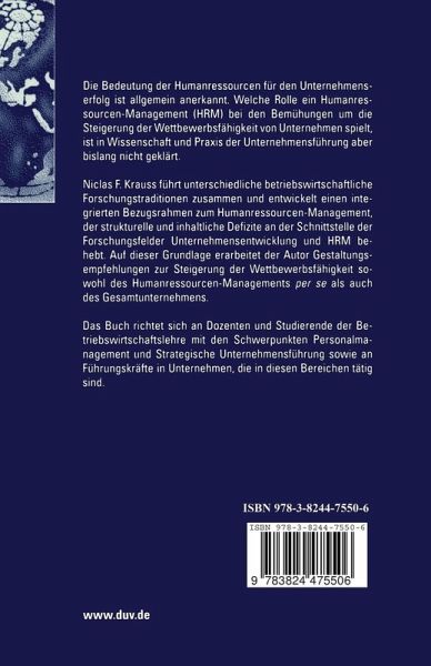 Niclas F. Krauss führt unterschiedliche betriebswirtschaftliche Forschungstraditionen zusammen und entwickelt einen integrierten Bezugsrahmen zum Humanressourcen-Management, der strukturelle und inhaltliche Defizite an der Schnittstelle der Forschungsfelder Unternehmensentwicklung und HRM behebt. Auf dieser Grundlage erarbeitet der Autor Gestaltungsempfehlungen zur Steigerung der Wettbewerbsfähigkeit sowohl des Humanressourcen-Managements per se als auch des Gesamtunternehmens.