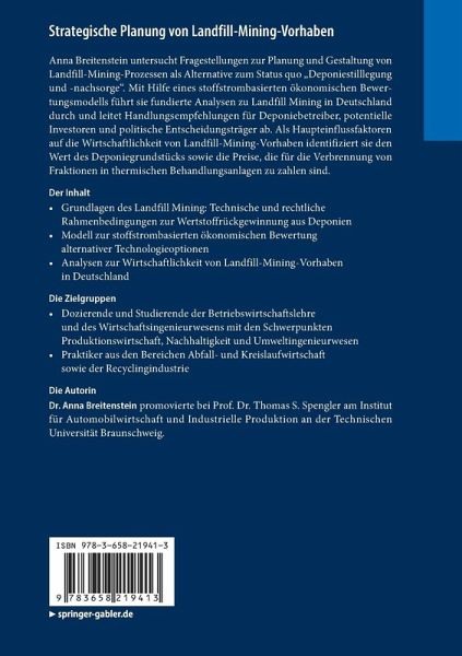 Anna Breitenstein untersucht Fragestellungen zur Planung und Gestaltung von Landfill-Mining-Prozessen als Alternative zum Status quo "Deponiestilllegung und -nachsorge". Mit Hilfe eines stoffstrombasierten ökonomischen Bewertungsmodells führt sie fundierte Analysen zu Landfill Mining in Deutschland durch und leitet Handlungsempfehlungen für Deponiebetreiber, potentielle Investoren und politische Entscheidungsträger ab. Als Haupteinflussfaktoren auf die Wirtschaftlichkeit von Landfill-Mining-Vorhaben identifiziert sie den Wert des Deponiegrundstücks sowie die Preise, die für die Verbrennung von Fraktionen in thermischen Behandlungsanlagen zu zahlen sind.