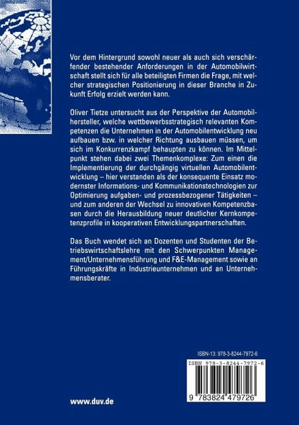 Oliver Tietze untersucht aus der Perspektive der Automobilhersteller, welche wettbewerbsstrategisch relevanten Kompetenzen die Unternehmen in der Automobilentwicklung neu aufbauen bzw. in welcher Richtung ausbauen müssen, um sich im Konkurrenzkampf behaupten zu können. Im Mittelpunkt stehen dabei zwei Themenkomplexe: Zum einen die Implementierung der durchgängig virtuellen Automobilentwicklung - hier verstanden als der konsequente Einsatz modernster Informations- und Kommunikationstechnologien zur Optimierung aufgaben- und prozessbezogener Tätigkeiten - und zum anderen der Wechsel zu innovativen Kompetenzbasen durch die Herausbildung neuer deutlicher Kernkompetenzprofile in kooperativen Entwicklungspartnerschaften.
