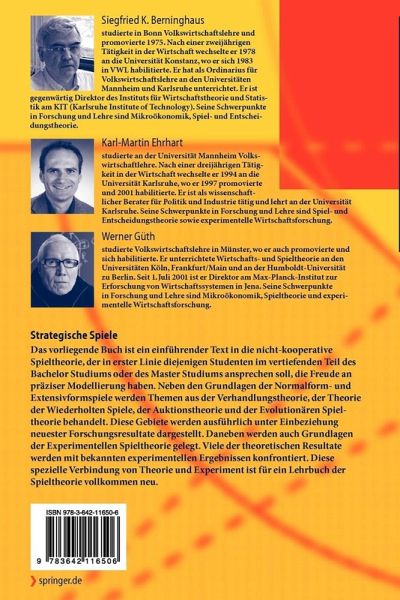 Das vorliegende Buch ist ein einführender Text in die nicht-kooperative Spieltheorie, der in erster Linie diejenigen Studenten im vertiefenden Teil des Bachelor Studiums oder des Master Studiums ansprechen soll, die Freude an präziser Modellierung haben. Neben den Grundlagen der Normalform- und Extensivformspiele werden Themen aus der Verhandlungstheorie, der Theorie der Wiederholten Spiele, der Auktionstheorie und der Evolutionären Spieltheorie behandelt. Diese Gebiete werden ausführlich unter Einbeziehung neuester Forschungsresultate dargestellt. Daneben werden auch Grundlagen der Experimentellen Spieltheorie gelegt. Viele der theoretischen Resultate werden mit bekannten experimentellen Ergebnissen konfrontiert. Diese spezielle Verbindung von Theorie und Experiment ist für ein Lehrbuch der Spieltheorie vollkommen neu.