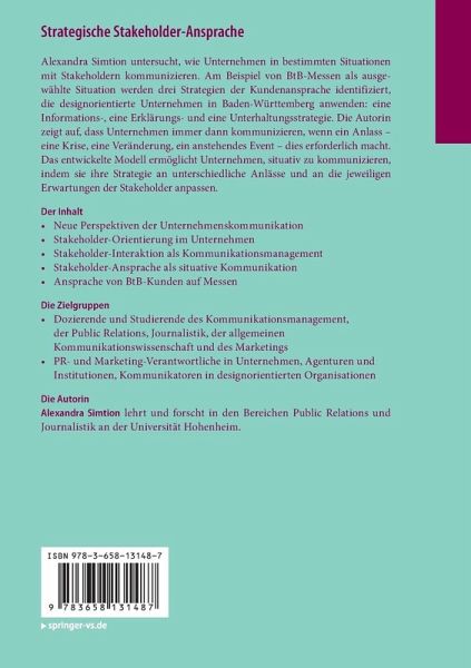 Alexandra Simtion untersucht, wie Unternehmen in bestimmten Situationen mit Stakeholdern kommunizieren. Am Beispiel von BtB-Messen als ausgewählte Situation werden drei Strategien der Kundenansprache identifiziert, die designorientierte Unternehmen in Baden-Württemberg anwenden: eine Informations-, eine Erklärungs- und eine Unterhaltungsstrategie. Die Autorin zeigt auf, dass Unternehmen immer dann kommunizieren, wenn ein Anlass - eine Krise, eine Veränderung, ein anstehendes Event - dies erforderlich macht. Das entwickelte Modell ermöglicht Unternehmen, situativ zu kommunizieren, indem sie ihre Strategie an unterschiedliche Anlässe und an die jeweiligen Erwartungen der Stakeholder anpassen.