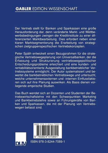 Der Vertrieb stellt für Banken und Sparkassen eine große Herausforderung dar, denn veränderte Markt- und Wettbewerbsbedingungen zwingen die Kreditinstitute zu einer differenzierten Marktbearbeitung. Dies erfordert neben einer klaren Marktsegmentierung die Erarbeitung von strategischen zielgruppenspezifischen Vertriebskonzepten. Peter Späth entwickelt einen Bezugsrahmen für die strategische Vertriebswegeplanung von Universalbanken, der die Erfassung und Strukturierung vertriebswegepolitischer Entscheidungsprobleme erleichtert und eine kunden- und rentabilitätsorientierte Ausgestaltung bankbetrieblicher Vertriebssysteme ermöglicht. Der Autor systematisiert und bewertet die bankbetrieblichen Vertriebswege und untersucht, welche unternehmensexternen und -internen Einflussfaktoren sich auf ihre Planung auswirken. Als Basis dienen vorliegende empirische Studien.