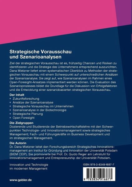 Dana Mietzner liefert einen systematischen Überblick zu Methoden der strategischen Vorausschau mit einem Schwerpunkt auf unterschiedlichen Ansätzen der Szenarioanalyse. Sie zeigt auf, wie Szenarioanalysen im Rahmen eines Open-Foresight-Ansatzes implementiert werden können. Die Evaluation des Szenarioprozesses bildet die Grundlage für die Diskussion von Erfolgsfaktoren und die Entwicklung einer szenariobasierten strategischen Vorausschau.