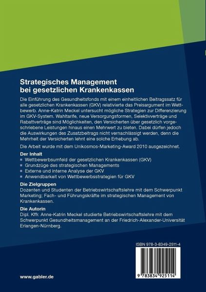 Die Einführung des Gesundheitsfonds 2009 mit einem einheitlichen B- tragssatz hat die Verhältnisse im Wettbewerb der Krankenkassen verändert. Welche Chancen und Risiken entstehen für die gesetzlichen Krank- kassen? Welche Stärken können sie nutzen, auf welche Schwächen sollten sie reagieren? Welche strategischen Möglichkeiten haben die Kassen um sich im Wettbewerb erfolgreich von ihren Mitbewerbern abzusetzen? Die vorliegende Arbeit beschäftigt sich auf systematische und sehr - schauliche Weise mit dem "Strategischen Management bei gesetzlichen Krankenkassen". Neben einer externen und internen strategischen Analyse der gesetzlichen Krankenkassen wird der Frage nachgegangen, welche Wettbewerbsstrategien für die Kassen anwendbar sind. Die Arbeit wurde mit dem Unikosmos Marketing Award für das Wint- semester 2009/2010 ausgezeichnet. Dieser Preis wird für innovative Marketing-Ideen an junge Wissenschaftler von der Techniker Krankenkasse in Zusammenarbeit mit der Agentur Public Address vergeben. Matthias Dressler Vorwort Die gesetzlichen Krankenkassen sind, als Körperschaften des öffentlichen Rechts, nicht mit Unternehmen am freien Markt zu vergleichen. Die E- führung eines einheitlichen Beitragssatzes hat die Krankenkassen vor neue Herausforderungen gestellt. In dieser Arbeit sind die Einflussfaktoren auf die Krankenkassen und die Auswirkungen des einheitlichen Beitragssatzes auf die wettbewerbliche Ausrichtung der gesetzlichen Krankenkassen von besonderem Interesse. Die Idee dieser Diplomarbeit entstand zusammen mit Herrn Dr. Martin Emmert. Ich möchte mich auf diesem Wege noch einmal bei ihm für seine großartige Unterstützung, seine kritischen Durchsichten und seine konstruktiven Verbesserungsvorschläge bedanken. Ich danke auch Herrn Prof. Dr.Schöffski für das Vorschlagen meiner Diplomarbeit für den Unikosmos Marketing Award sowie Herrn Prof. Dr.