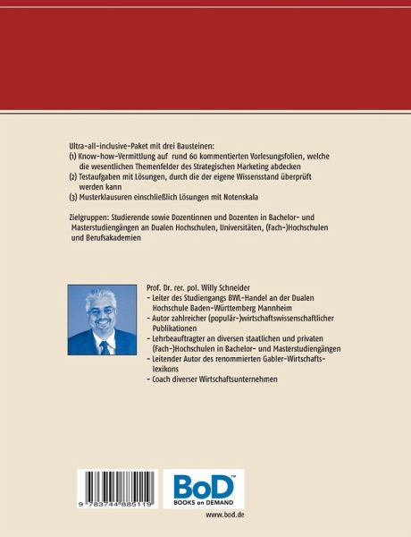 Ultra-all-inclusive-Paket mit drei Bausteinen:(1) Know-how-Vermittlung auf rund 60 kommentierten Vorlesungsfolien, welche die wesentlichen Themenfelder des Strategischen Marketing abdecken(2) Testaufgaben mit Lösungen, durch die der eigene Wissensstand überprüft werden kann(3) Musterklausuren einschließlich Lösungen mit NotenskalaZielgruppen: Studierende sowie Dozentinnen und Dozenten in Bachelor- und Masterstudiengängen an Dualen Hochschulen, Universitäten, (Fach-)Hochschulen und Berufsakademien