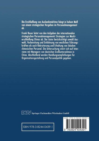 Die Erschließung von Auslandsmärkten hängt in hohem Maß von einem strategischen Vorgehen im Personalmanagement ab. Frank Rexer leitet von den Aufgaben des internationalen strategischen Personalmanagements Strategien zur Markterschließung Chinas ab. Der Autor berücksichtigt sowohl Auswahl, Vorbereitung und Entlohnung von westlichen Führungskräften als auch Rekrutierung und Erhaltung von lokalem chinesischen Personal. Die Untersuchung stützt sich auf Interviews mit Managern von deutschen Großunternehmen in China. Abschließend werden Handlungsempfehlungen für Organisationsgestaltung und Personalpolitik gegeben.
