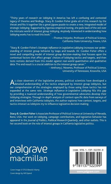 "Stacy B. Gordon Fisher's Strategizing Influence in Legislative Lobbying increases our understanding of interest group behavior by leaps and bounds. Dr. Gordon Fisher offers a novel and compelling model of interest group decision-making that focuses upon the contextual factors that affect groups' choices of lobbying tactics and targets, and then tests notions derived from this model against real worldquantitative and qualitative data. The end result is a crucial addition to the interest group canon." - Anthony J. Nownes, Professor of Political Science, University of Tennessee, Knoxville, USA