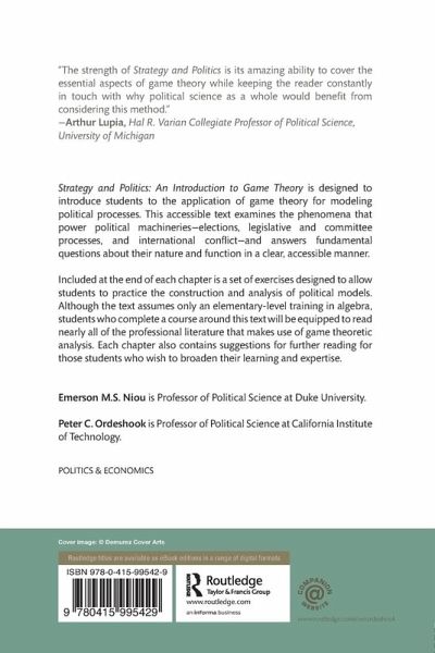 Strategy and Politics: An Introduction to Game Theory is designed to introduce students with no background in formal theory to the application of game theory to modeling political processes. This accessible text covers the essential aspects of game theory while keeping the reader constantly in touch with why political science as a whole would benefit from considering this method. Examining the very phenomena that power political machineries-elections, legislative and committee processes, and international conflict, the book attempts to answer fundamental questions about their nature and function in a clear, accessible manner. Included at the end of each chapter is a set of exercises designed to allow students to practice the construction and analysis of political models. Although the text assumes only an elementary-level training in algebra, students who complete a course around this text will be equipped to read nearly all of the professional literature that makes use of game theoretic analysis.