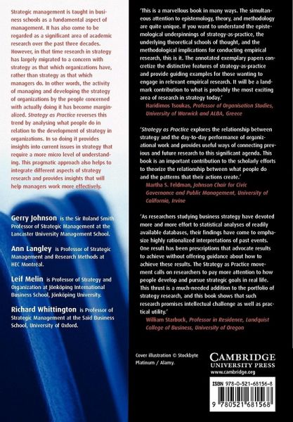 Research in strategy has shifted significantly towards strategy as something organizations have, rather than strategy as something that managers do. The activities of the people who actually manage and develop organizational strategy have become marginalized. Strategy as Practice argues the reverse: that research on strategy needs to take seriously what strategists do and the effects of what they do. Written by a distinguished team of researchers and educators, the book sets out a research agenda, provides guidelines on theoretical perspectives and alternative methodologies for research on practice as well as commentaries on published illustrative papers that exemplify the practice perspective. Strategy as Practice will be essential reading for doctoral students, researchers and academics who wish to understand or undertake research in this important field of management research.
