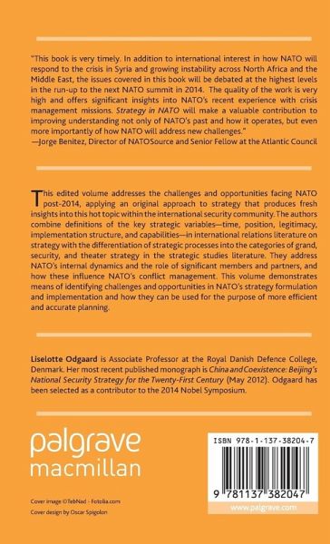 Table of Contents 1. Introduction; Villiam Krüger-Klausen and Liselotte Odgaard 2. Preparing for an Imperfect World: Strategy in Conflict Management Environments; Villiam Krüger-Klausen and Liselotte Odgaard 3. NATO's Future Strategy: Ready for the Threats of the Future or Refighting the Battles of the Past?; Jamie Shea 4. U.S. National Security Strategy and NATO; Robert H. Dorff 5. The Indispensable Enabler: NATO's Strategic Value in High Intensity Operations Is Far Greater than You Think; Peter Viggo Jakobsen 6. NATO and EU - A 'Strategic Partnership' or a Practice of 'Muddling Through'?; Trine Flockhart 7. NATO and Libya: The Dawn of European Security Management, a Warning, or Business as Usual?; Mark Laity 8. International Law and the Role of Legitimacy; Heidi Güntelberg 9. When Strategy Ends; David Vestenskov and Lars Wille-Jørgensen 10. Time and the Question of Unintended Influences on Military Strategy; Thomas Galasz Nielsen 11. Strategizing NATOs Narratives; Thomas Elkjer Nissen 12. Effect-Based Thinking in NATO, Utilizing All Instruments of Power During Planning for and Conduct of Operations; Hans Henrik Møller