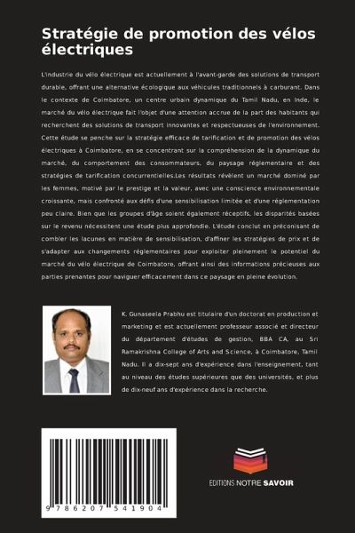 L'industrie du vélo électrique est actuellement à l'avant-garde des solutions de transport durable, offrant une alternative écologique aux véhicules traditionnels à carburant. Dans le contexte de Coimbatore, un centre urbain dynamique du Tamil Nadu, en Inde, le marché du vélo électrique fait l'objet d'une attention accrue de la part des habitants qui recherchent des solutions de transport innovantes et respectueuses de l'environnement. Cette étude se penche sur la stratégie efficace de tarification et de promotion des vélos électriques à Coimbatore, en se concentrant sur la compréhension de la dynamique du marché, du comportement des consommateurs, du paysage réglementaire et des stratégies de tarification concurrentielles.Les résultats révèlent un marché dominé par les femmes, motivé par le prestige et la valeur, avec une conscience environnementale croissante, mais confronté aux défis d'une sensibilisation limitée et d'une réglementation peu claire. Bien que les groupes d'âge soient également réceptifs, les disparités basées sur le revenu nécessitent une étude plus approfondie. L'étude conclut en préconisant de combler les lacunes en matière de sensibilisation, d'affiner les stratégies de prix et de s'adapter aux changements réglementaires pour exploiter pleinement le potentiel du marché du vélo électrique de Coimbatore, offrant ainsi des informations précieuses aux parties prenantes pour naviguer efficacement dans ce paysage en pleine évolution.