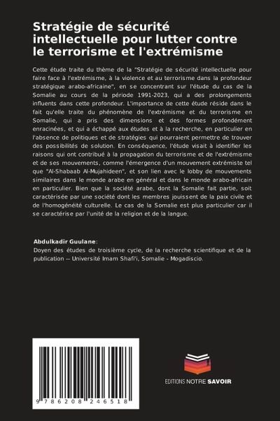 Cette étude traite du thème de la "Stratégie de sécurité intellectuelle pour faire face à l'extrémisme, à la violence et au terrorisme dans la profondeur stratégique arabo-africaine", en se concentrant sur l'étude du cas de la Somalie au cours de la période 1991-2023, qui a des prolongements influents dans cette profondeur. L'importance de cette étude réside dans le fait qu'elle traite du phénomène de l'extrémisme et du terrorisme en Somalie, qui a pris des dimensions et des formes profondément enracinées, et qui a échappé aux études et à la recherche, en particulier en l'absence de politiques et de stratégies qui pourraient permettre de trouver des possibilités de solution. En conséquence, l'étude visait à identifier les raisons qui ont contribué à la propagation du terrorisme et de l'extrémisme et de ses mouvements, comme l'émergence d'un mouvement extrémiste tel que "Al-Shabaab Al-Mujahideen", et son lien avec le lobby de mouvements similaires dans le monde arabe en général et dans le monde arabo-africain en particulier. Bien que la société arabe, dont la Somalie fait partie, soit caractérisée par une société dont les membres jouissent de la paix civile et de l'homogénéité culturelle. Le cas de la Somalie est plus particulier car il se caractérise par l'unité de la religion et de la langue.