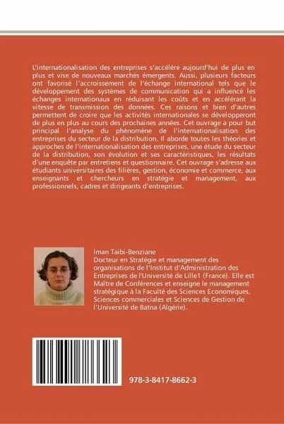 L'internationalisation des entreprises s'accélère aujourd'hui de plus en plus et vise de nouveaux marchés émergents. Aussi, plusieurs facteurs ont favorisé l'accroissement de l'échange international tels que le développement des systèmes de communication qui a influencé les échanges internationaux en réduisant les coûts et en accélérant la vitesse de transmission des données. Ces raisons et bien d'autres permettent de croire que les activités internationales se développeront de plus en plus au cours des prochaines années. Cet ouvrage a pour but principal l'analyse du phénomène de l'internationalisation des entreprises du secteur de la distribution. Il aborde toutes les théories et approches de l'internationalisation des entreprises, une étude du secteur de la distribution, son évolution et ses caractéristiques, les résultats d'une enquête par entretiens et questionnaire. Cet ouvrage s'adresse aux étudiants universitaires des filières, gestion, économie et commerce, aux enseignants et chercheurs en stratégie et management, aux professionnels, cadres et dirigeants d'entreprises.